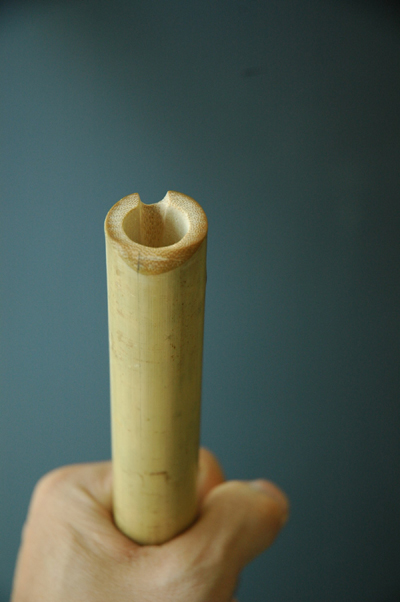 我 把 第 二 期 实 验 的 标 准 定 高 一 些 ,具 体 而 言 ,就 是 在 音 准 、制 作 工 艺细 腻 度 方 面 要 求 更 严 格 ,此 竹 材 的 内 径 为  20 mm,适 合 作 F 南 箫 。第 一 步 是 用 圆 锉 制 作 吹 口,这 次 还 是 做 U 口,吹 口 后 端 接 触 下巴 位 置 尽 量 弄 圆 滑 ,弄 完 发 觉 这 后 端 部 分 居 然 有 外 切 吹 口 feel!