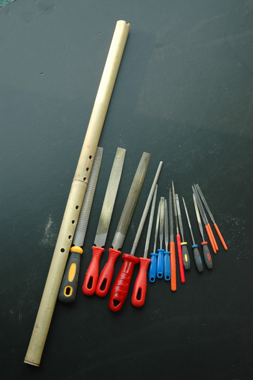 如 果 您 问 我 在 做 箫 后 期 制 作 中 ,那 件 工 具 最 重 要 ,我 会 马 上 告 诉 您 --是 各 式 各 样 的 锉 !用 电 钻 打 孔 后 ,我 用 各 种 大 小 、形 制 的 锉 子 打 磨 箫的 各 个 部 分。此 图 可 见 我 的 家 当 。