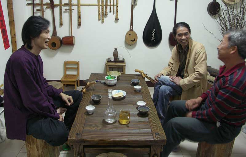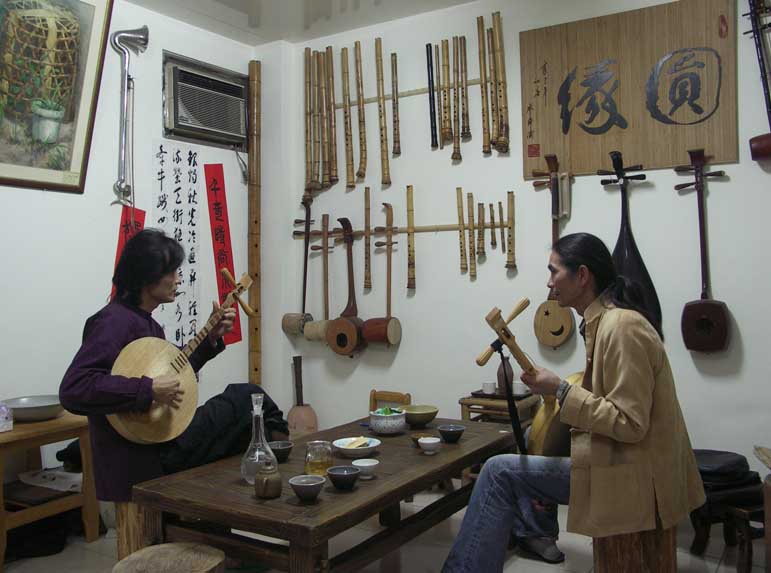 昨晚石碇九寮坡的主人高先生來訪,學習月琴彈唱的伴奏方式.