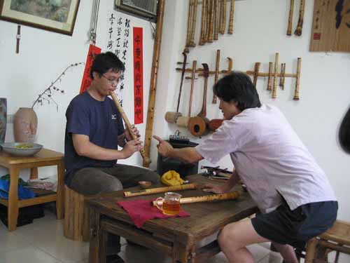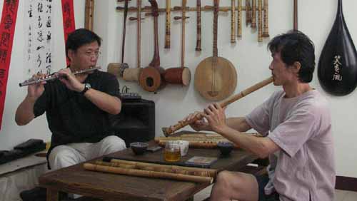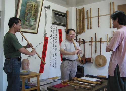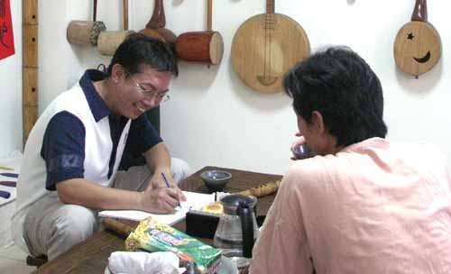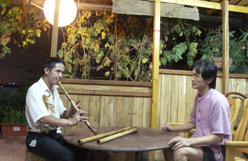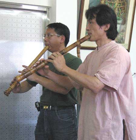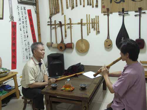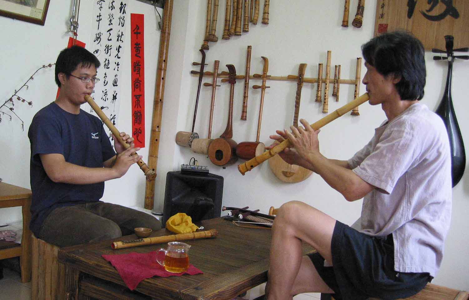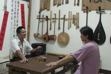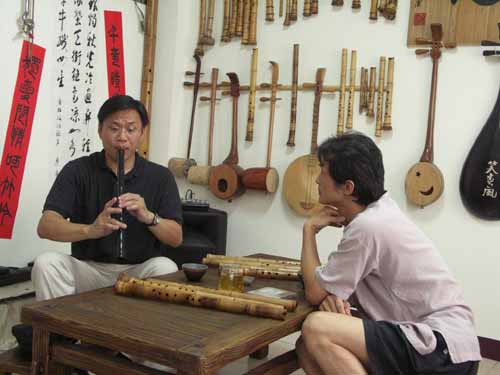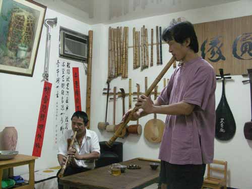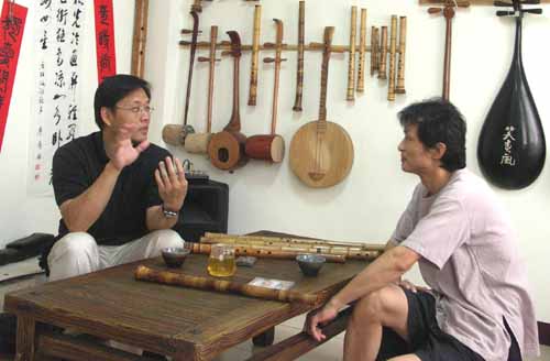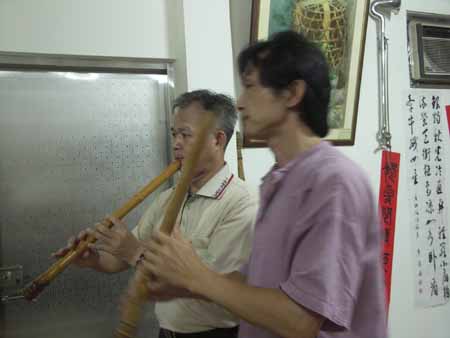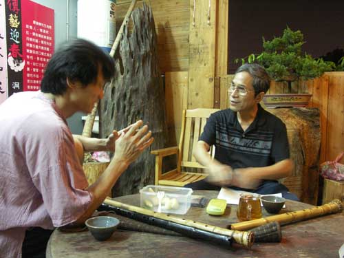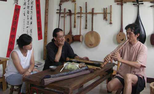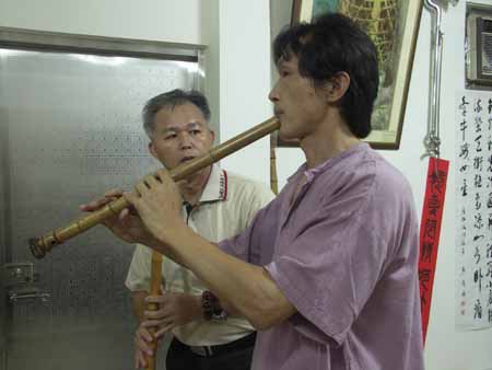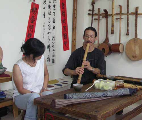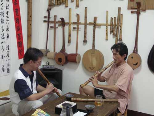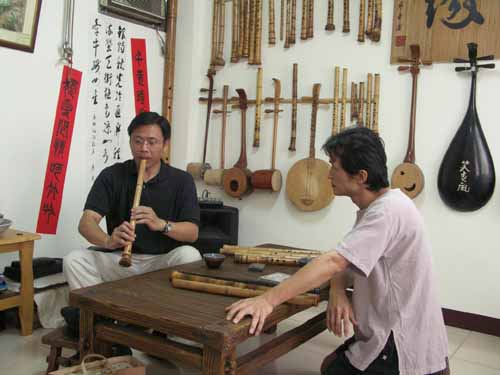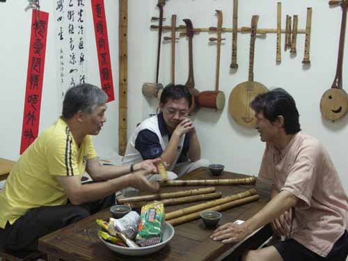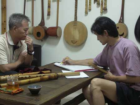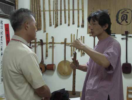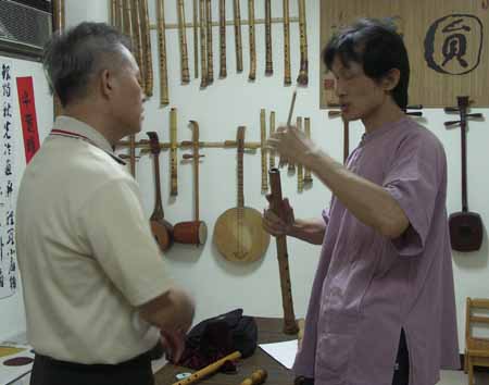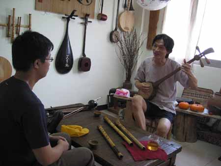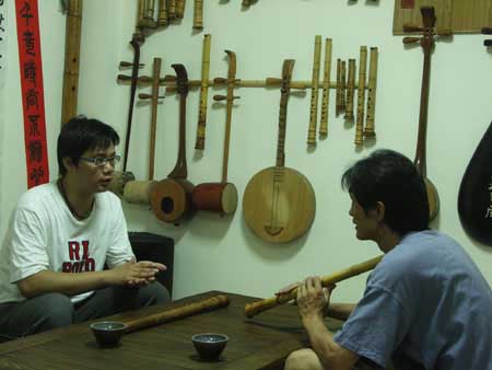 [楊先生也對台灣傳統音樂有興趣,彈一段敘述傳統樂器和奏模式.]
