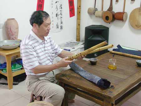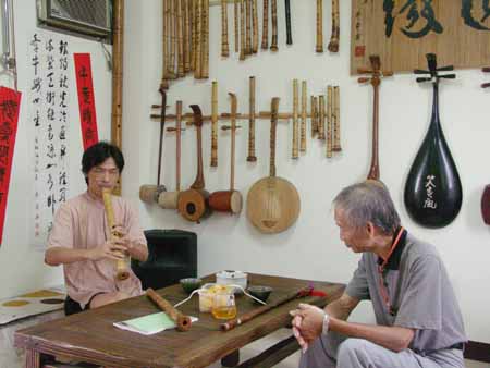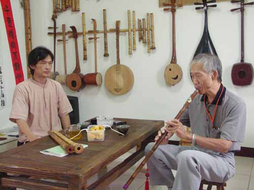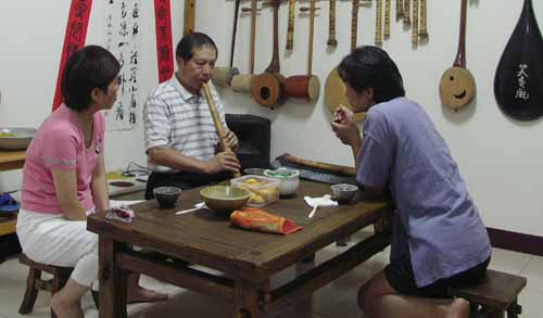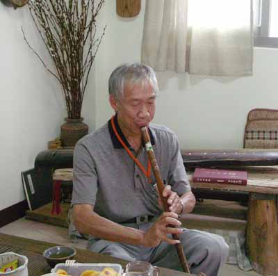 失明的吳木源先生週二晚間再來古調工作室,試吹我為他完成的十一孔唐口簫,