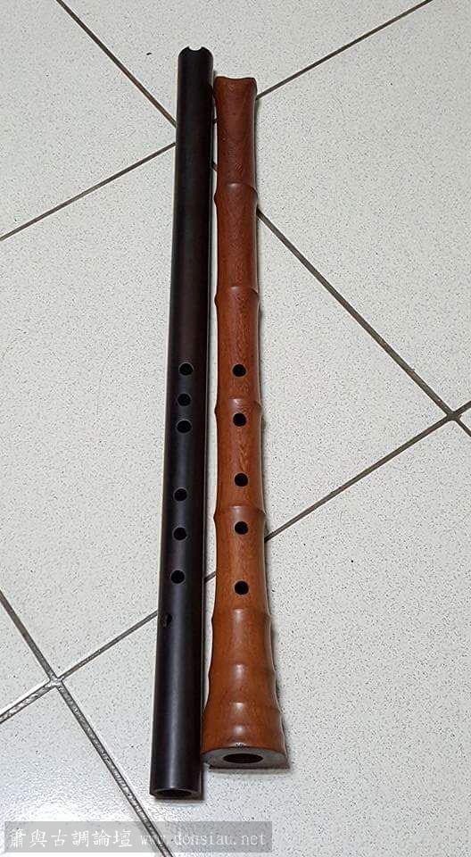 新實驗木簫(左),外觀沒看到節形,但節的穩定聲波功能仍然具有,如何將其藏於管中?主要在順纖維鑽孔,厚度曲線的拿捏,還有製作手磨方向,細節錄製影片說明