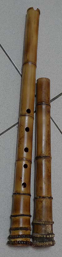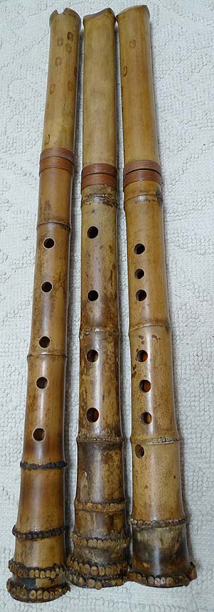 左起台灣南管六孔洞簫(南尺八)、日式五孔尺八(尺八)、台灣八孔DG洞簫(台灣尺八)