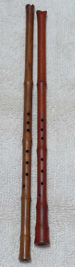 實驗紅花梨唐口琴簫無尾管(圖右),比對老檀U口有尾琴簫,細度接近,