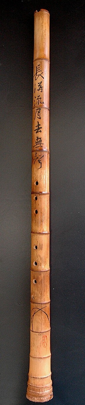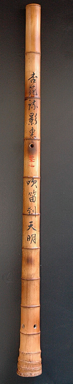 背面图,这箫所刻句子取自南宋陈与义《临江仙》:长沟流月去无声,杏花疏影里,吹笛到天明。