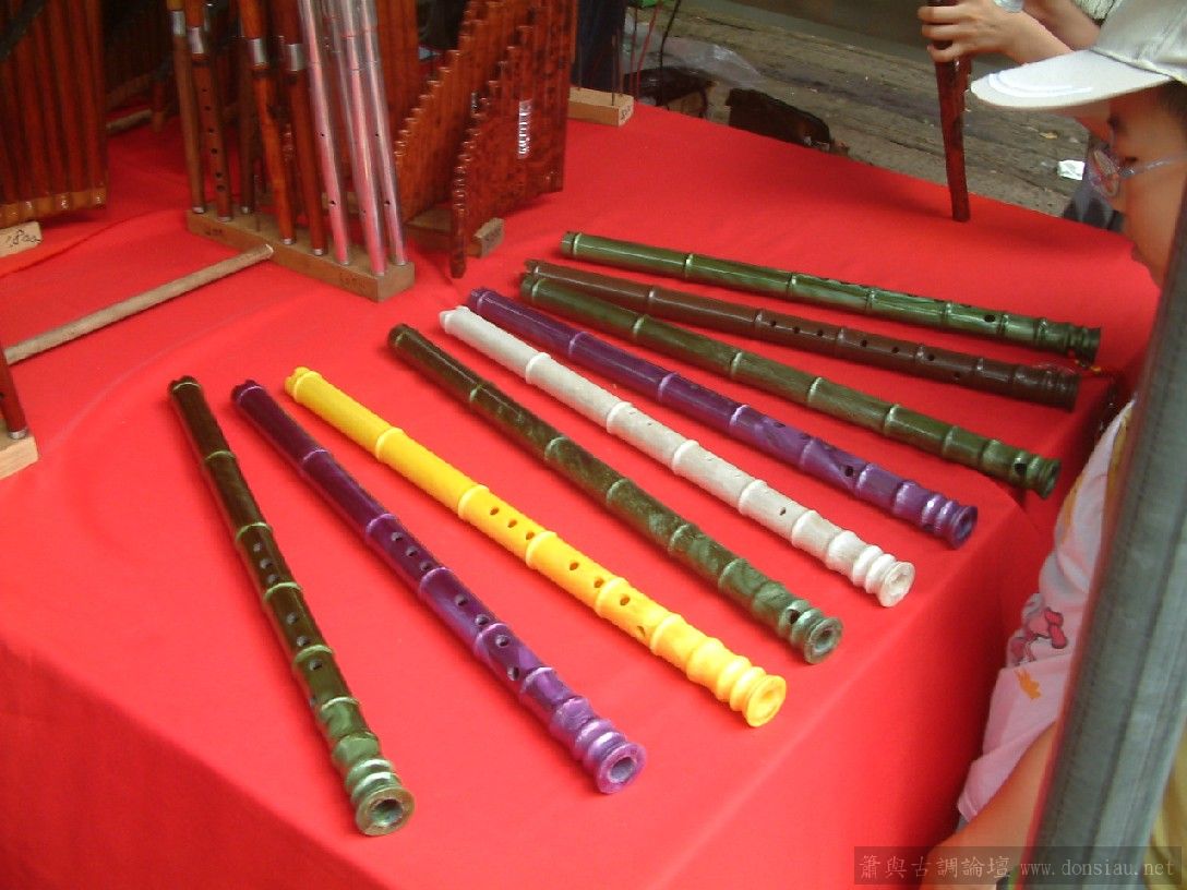 參觀中看到了一個洞簫、排笛〈簫〉的攤位(如照片),擺放著幾把色彩鮮豔的塑料模製洞簫,有U吹口有尺八吹口,據擺攤者說,是臺中一位老師研製的,售價亦不高,每把要價新台幣600元,我信手拿了幾把試吹,最後還是決定把它擺放回去,空手離開。