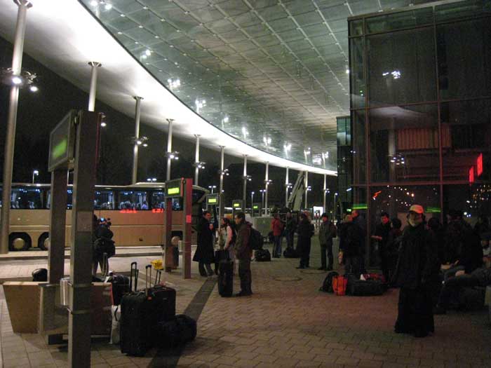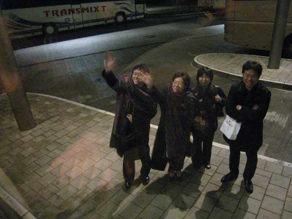 寒夜中等待開往法蘭克福的公車,刺骨寒風中,謝大使衣衫單薄,只多圍了一條鄭老師加給他的原住民圖騰的圍巾,率同代表處人員與團員們一起候車,當時以凌晨時分,上車後看著揮別的身影,無限感動!