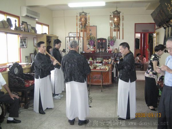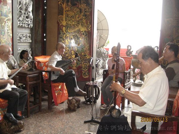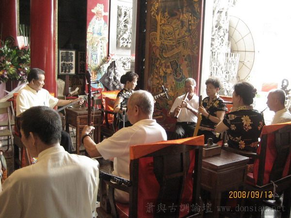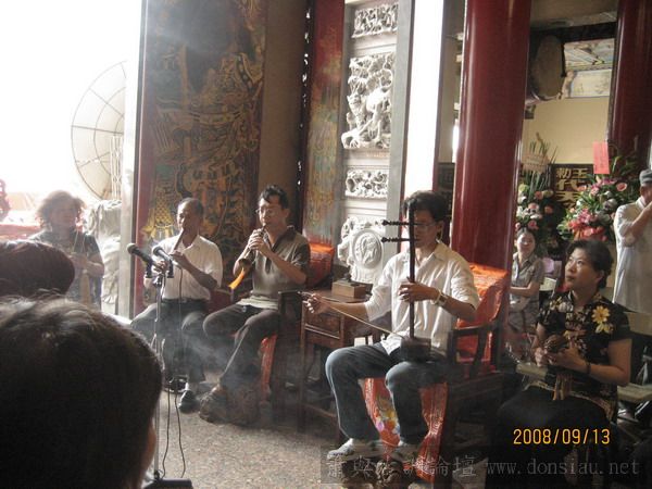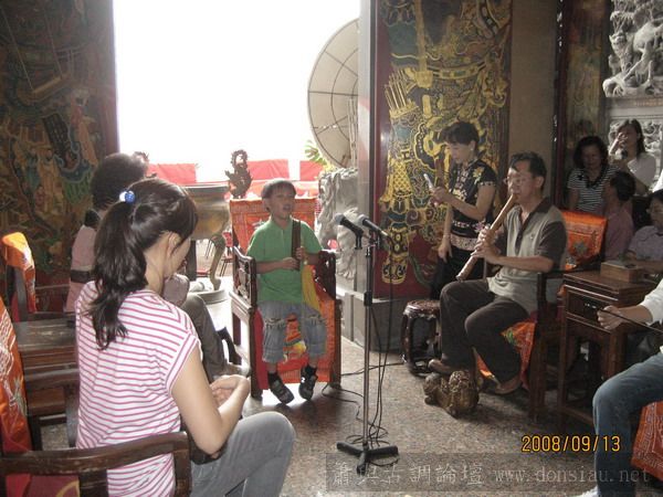 按照往例祭祀完之後開始整弦活動,開場是南聲社演奏品管的十音,可是好像不只十音了!在等待午餐之前來訪的客人陸續上場演奏,阿義也在客人不多的情形下上場吹噯,真是緊張得很!