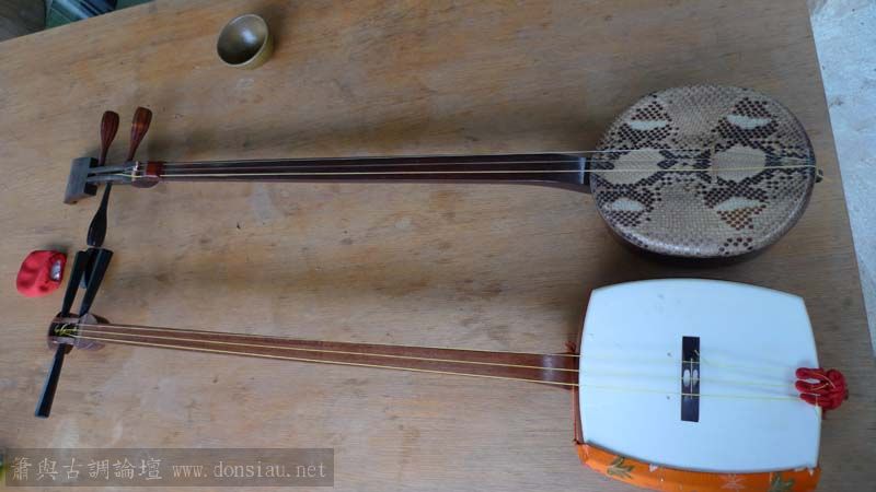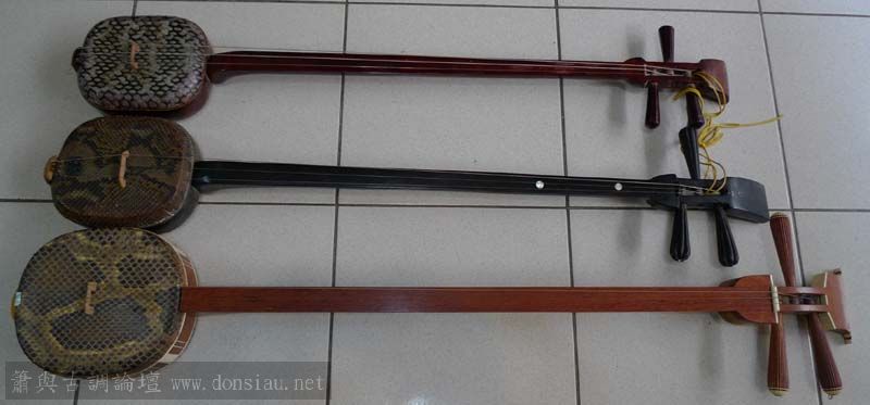 圖一下兩把桐面三弦是典型台灣戲曲或彈唱用三弦,大型方形是三重埔已故老藝人張先生所製,