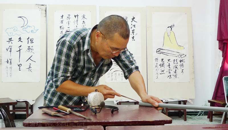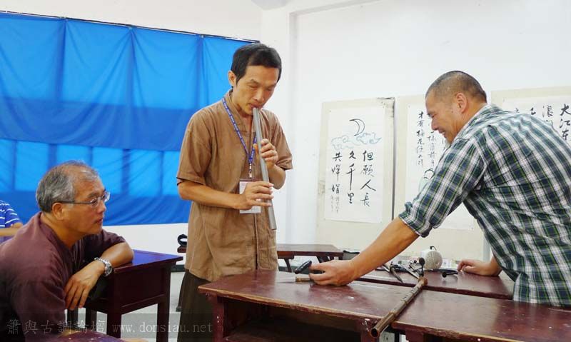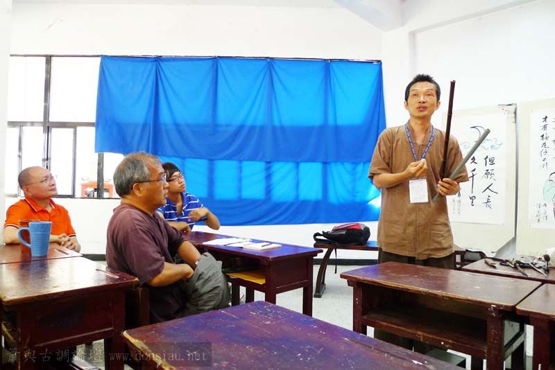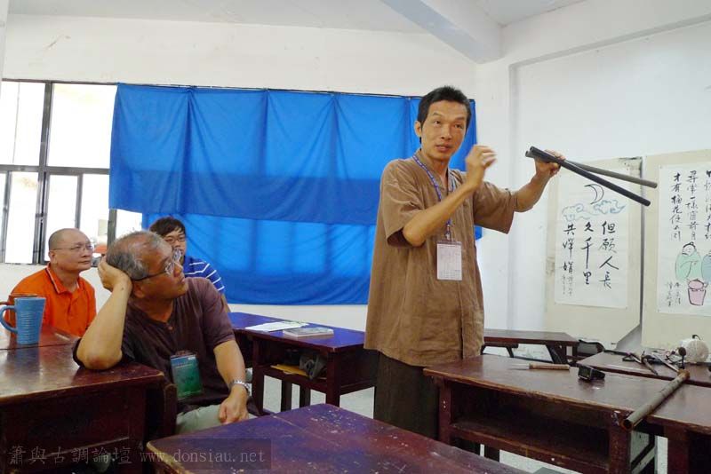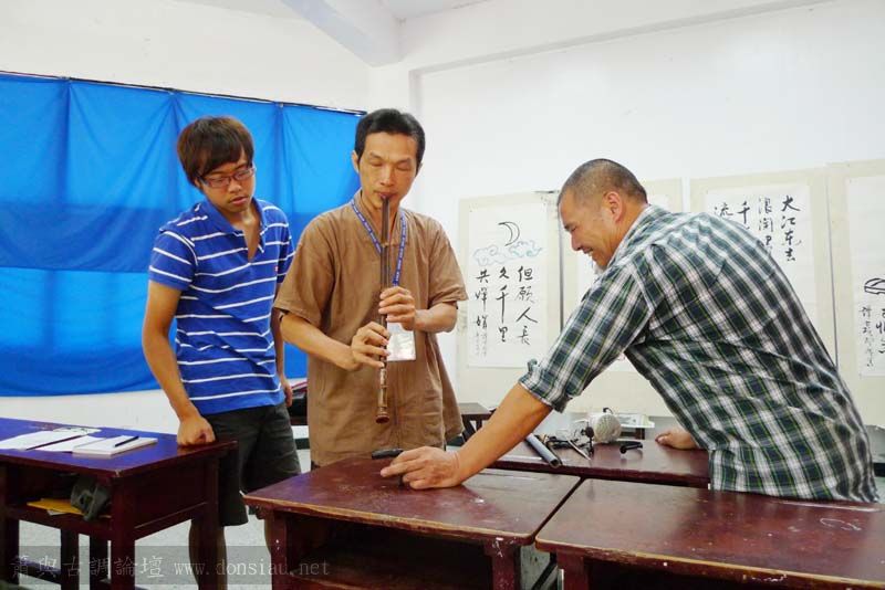陳光老師講解製簫,以平行水管示範吹口調整差異與實吹泛音列數量變化