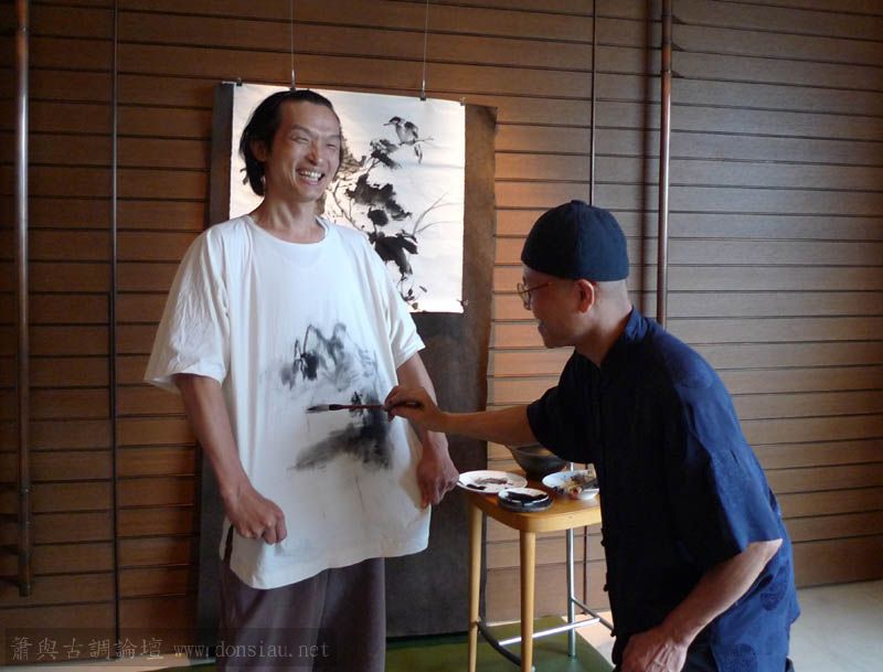 後續有其師妹也揮毫助性,文松乃將老婆所縫製上衣讓李老師揮毫作畫,