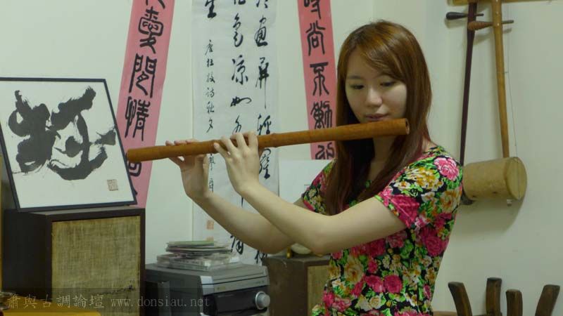 F調木琴簫我原來開孔以自然持簫位置,他以指端按孔困難,我協力在他吹春江曲中按孔,