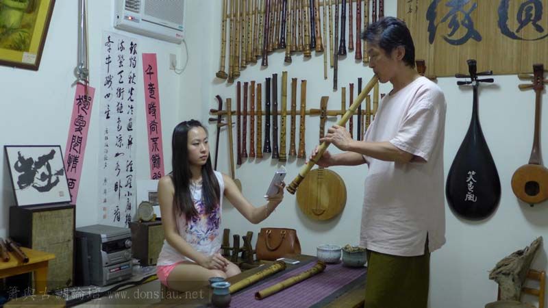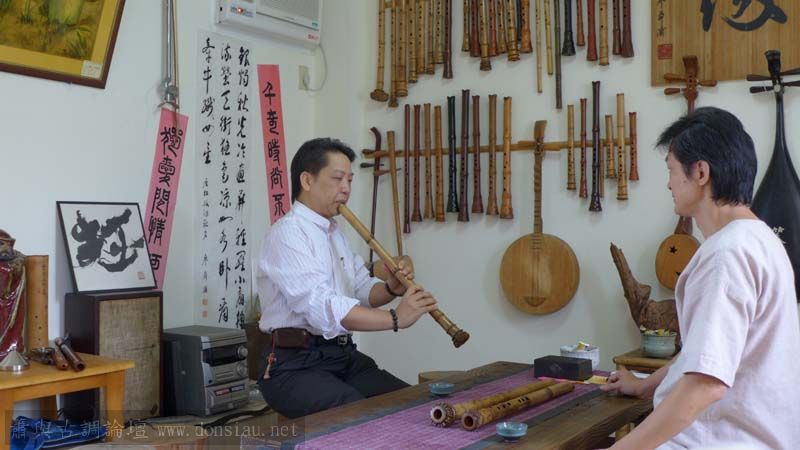 留學日本的陳教授當年在日本學尺八三個月,沒吹出聲音而放棄,卻沒忘記對尺八的熱愛,經常創作尺八曲,與尺八家福田輝久合作;文松在幾秒內讓他吹響,愛上文松最近完成的老檀寬宏曲線音色,出讓我的最新隨身唐尺八