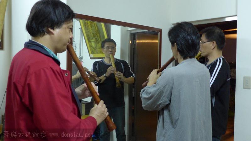 劉老師剛剛演完張玉樹教授的創作〔秋〕簫與弦樂四重奏,挑戰文松簫超高音的新曲,超高音吹響不難,吹弱音就有相當高難度,演後他自覺還可以更好,因為演出壓力與緊張減損,趁機會我示範鬆口風的弱高音吹法,大家都相當訝異,高音達到的纖細度與純淨度,劉老師的低音濃度已經進步很多,高音在練成放鬆法,他不久將開簫獨奏會,相信他的簫韻會很有潛力!