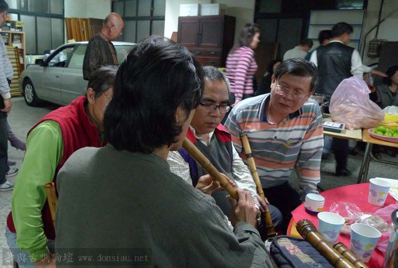 大家用心學習,實際演練;也有簫友拿出自製簫來比較,文松試吹給意見參考.