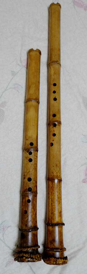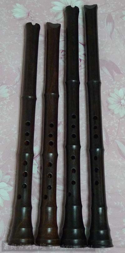 左起木製G調唐口F調U口,高壓碳化竹G、F唐口各一,孟宗合竹U口G調