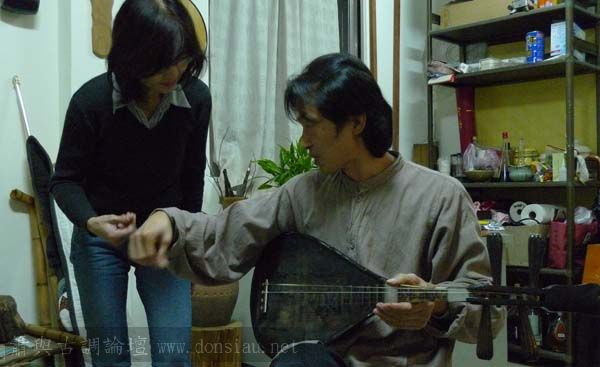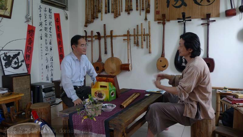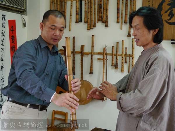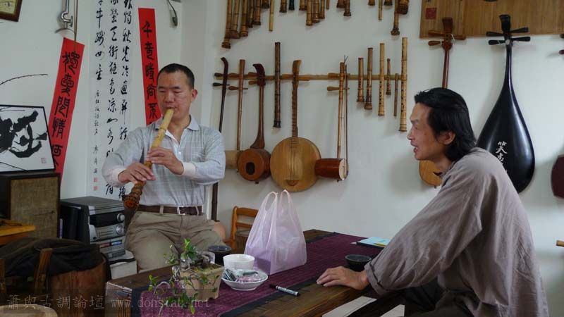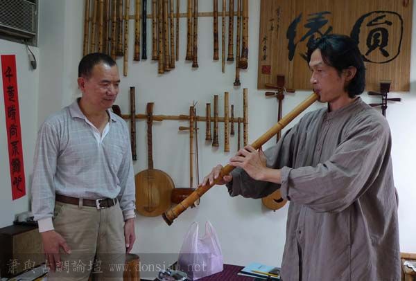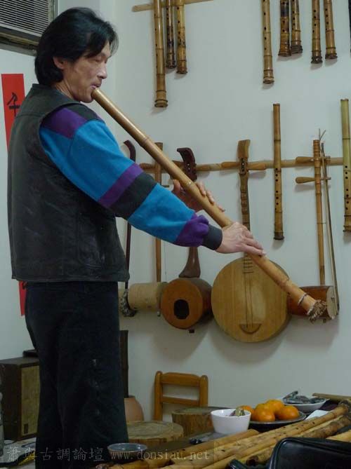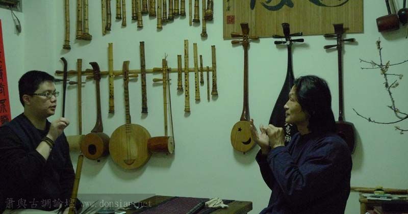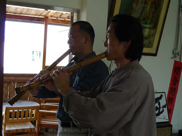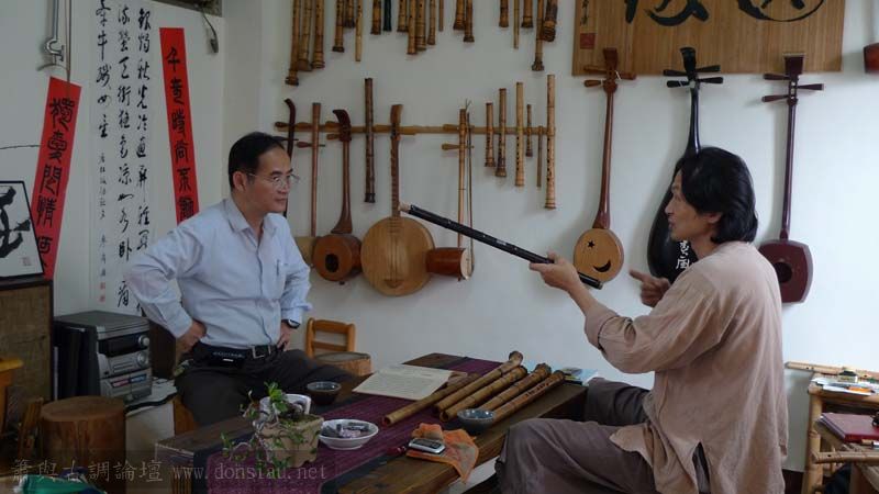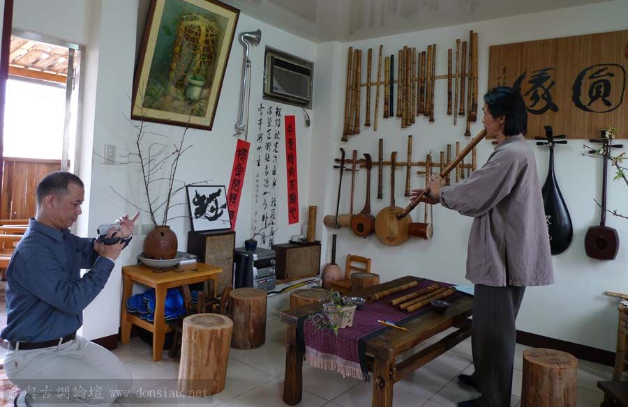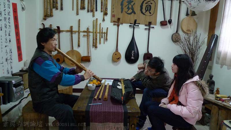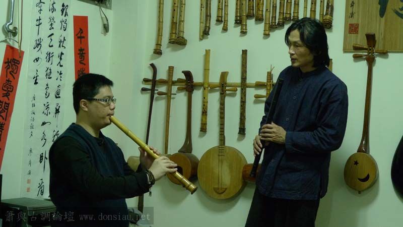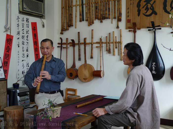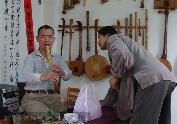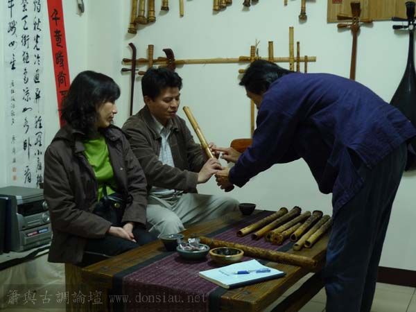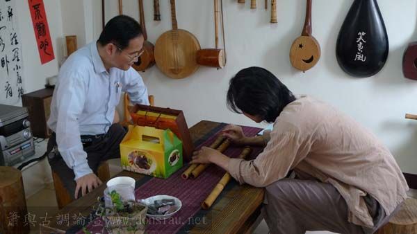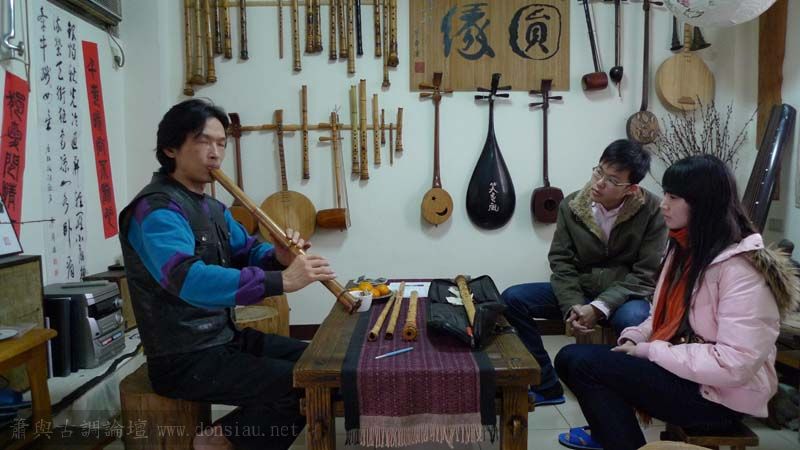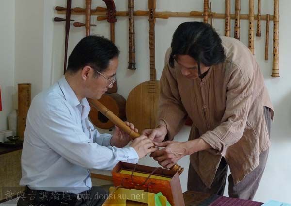 我以月琴示範點挑輪等要訣;蔡先生自習過南管簫,開始學習使用八孔簫,出讓G調八孔簫一管.