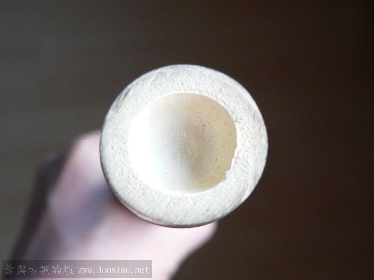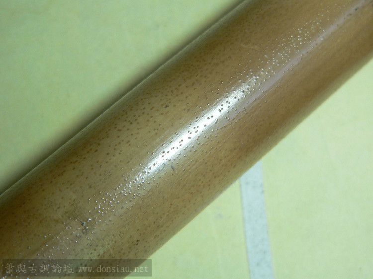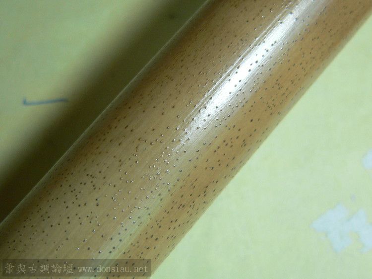 去年底挖的竹材,當時沒有殺青拔油,存放在雜屋間。因雜屋間溫度高且不通風,最近查看了一下,大多竹材都還是青色的,有的重量明顯減輕了,估計是水分丟失,加之竹材不夠老到的緣故。有好幾根竹材表面都長出了密密麻麻的浮點,開始以為生了蟲子,仔細看又不是,又像是朽掉了。請教了幾位老師,有說是竹材所含糖分發酵所致,請教文松老師到底是什麽原因呢?後來我簡單處理了一管,通過烘烤拔油,浮點仍無法去除。此管全長77.5CM,吹口端內徑1.8-1.9CM。是直接做整管好?還是将上端去掉一節好呢?