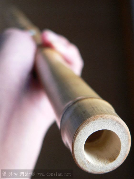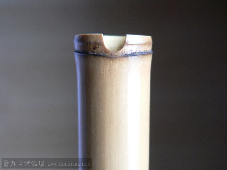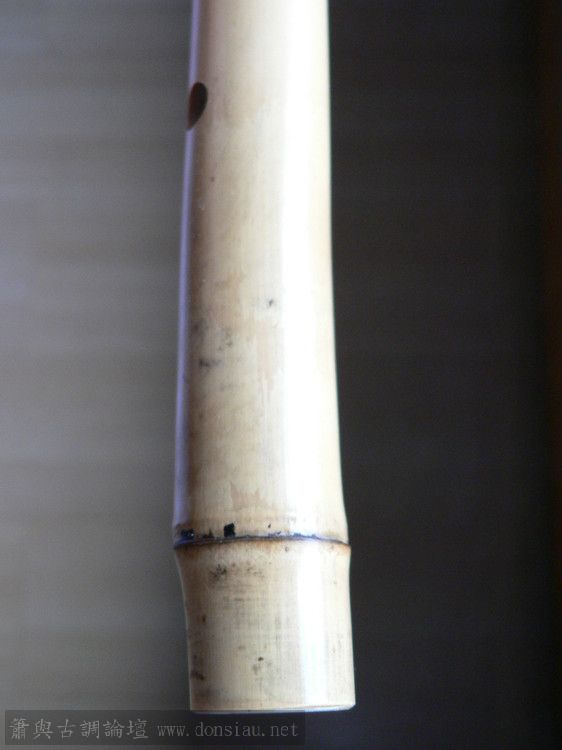 此管全长65.3CM,吹口端内径1.7CM,管尾内径1.5CM,尾部微弯。在挖第二孔时发现音偏高了,只好用AB胶回填。