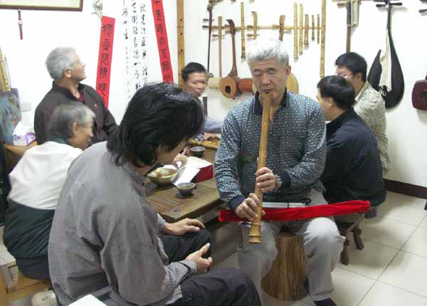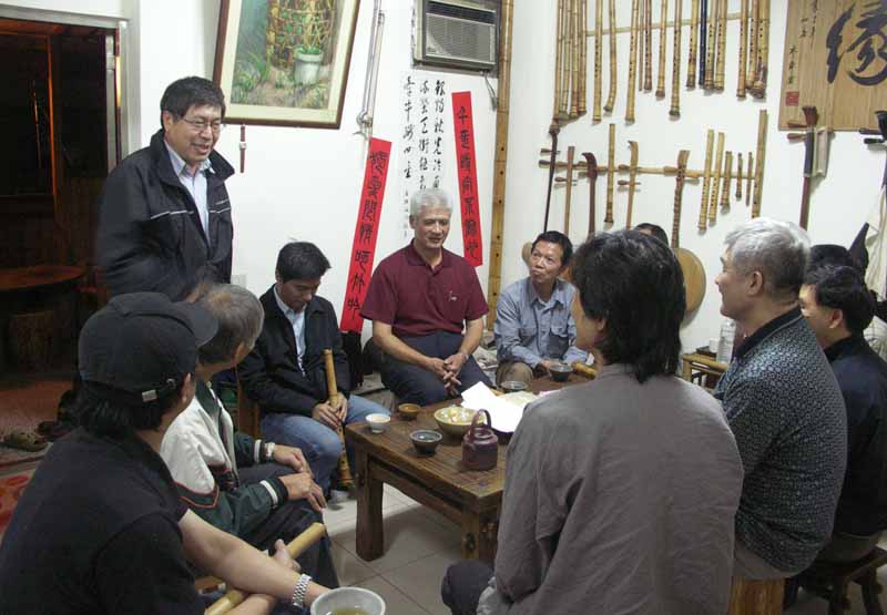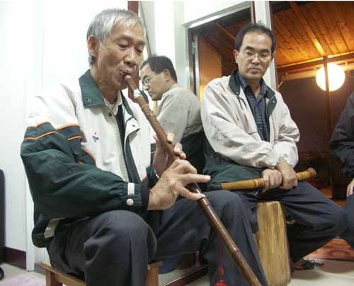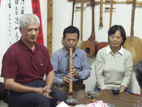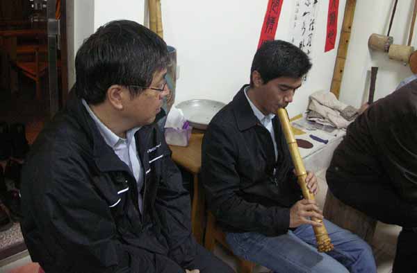 王先生帶領失明的吳先生與張先生也到達。張先生吹的是九孔簫與十孔簫,其樂天的心看在臉上!