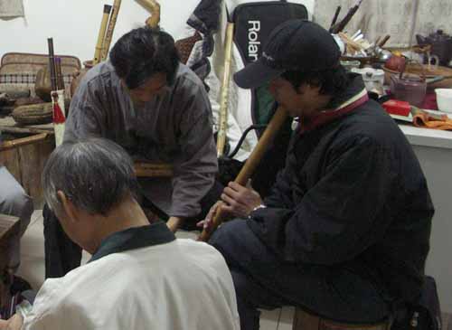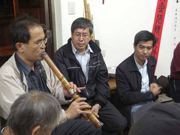 晚到的燈立兄正試吹錦德兄新作二尺管。