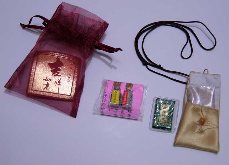 鄭老師為大家準備了每人一個特製背(福)袋,還有在染色中的大衣;沈導演從承天禪寺帶來師父給每位團員的祝福,有金剛沙、神咒、香包...收到時很感動!原來計畫行前團隊到承天禪寺祭拜並於寺中演一場,可惜沒有適當機會,不過這包祝福精緻禮物,收到滿懷溫馨與感動!