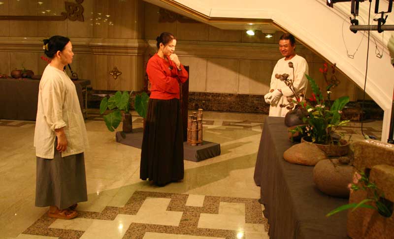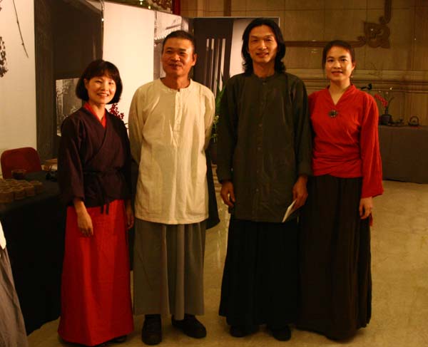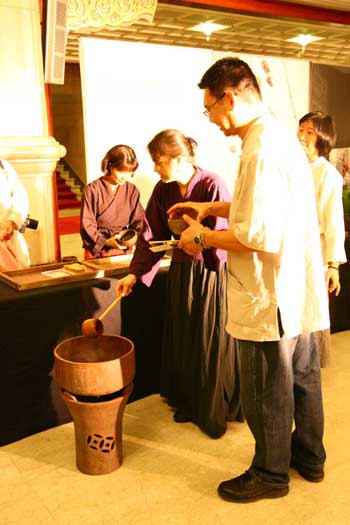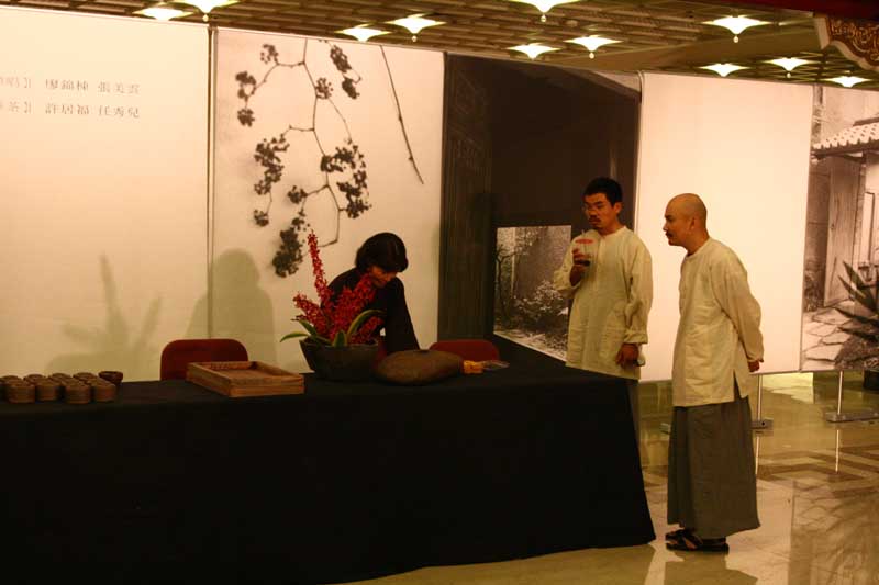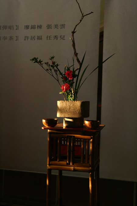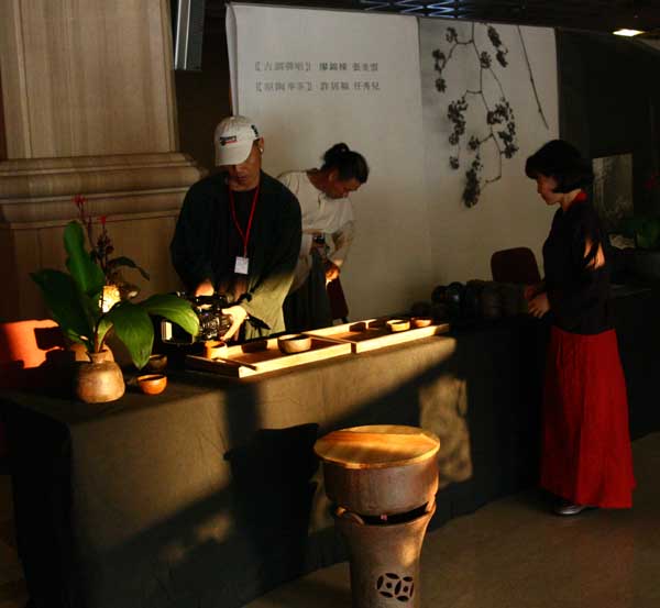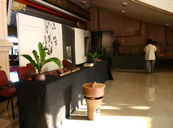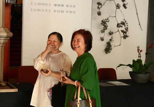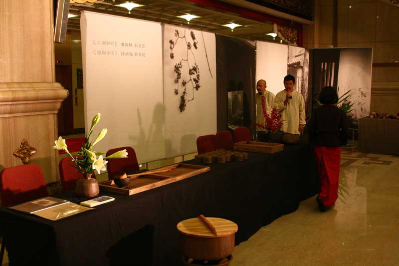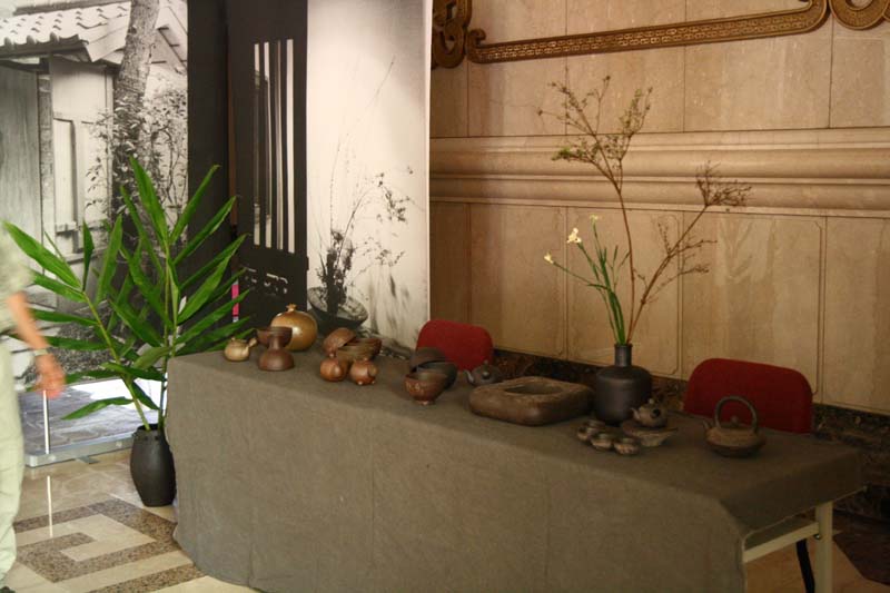 鄭惠中老師負責場地規劃,邀請陶藝家許居福伉儷參與陶藝展出及俸茶,將音樂廳西側大廳佈置得古色古香,
