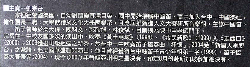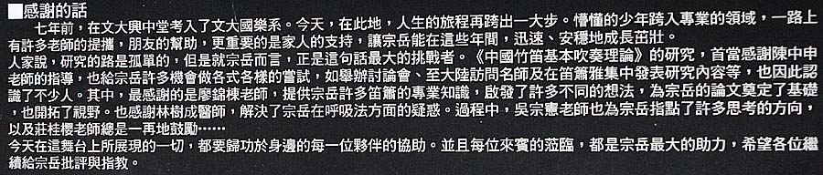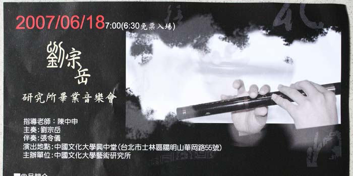 昨晚是劉宗岳同學的研究所畢業音樂會,傍晚陳中申老師來電提醒,我與內人乃驅車上陽明山文化大學,聆賞劉同學精采的竹笛獨奏;劉同學的畢業論文引用文松製簫多聲波共鳴理論,並使用文松調製的大笛演奏,是我參與音樂會並觀禮通過碩士畢業的頒證的意義,會後劉同學特別介紹與致謝.